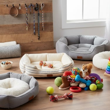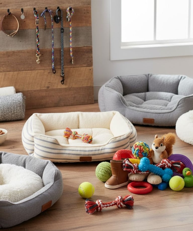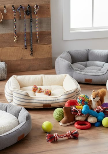 Caminhas, roupinhas, coleiras e comedouros para o conforto.