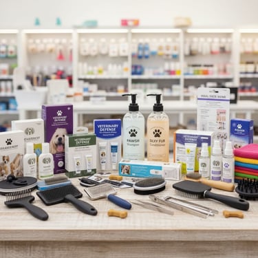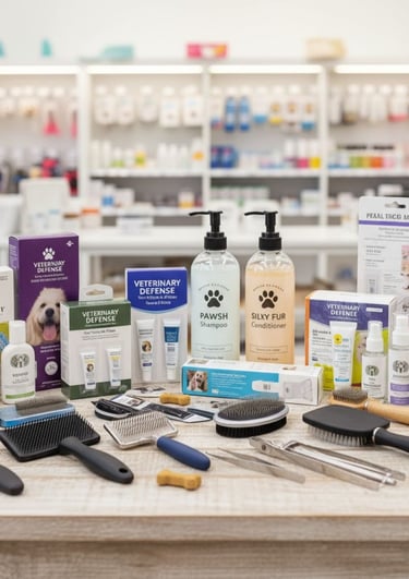 Shampoos, medicamentos e vermífugos para saúde completa.