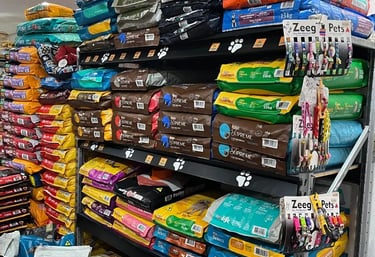 Caminhas, roupinhas, coleiras, comedouros e brinquedos para o conforto e diversão do seu animal.